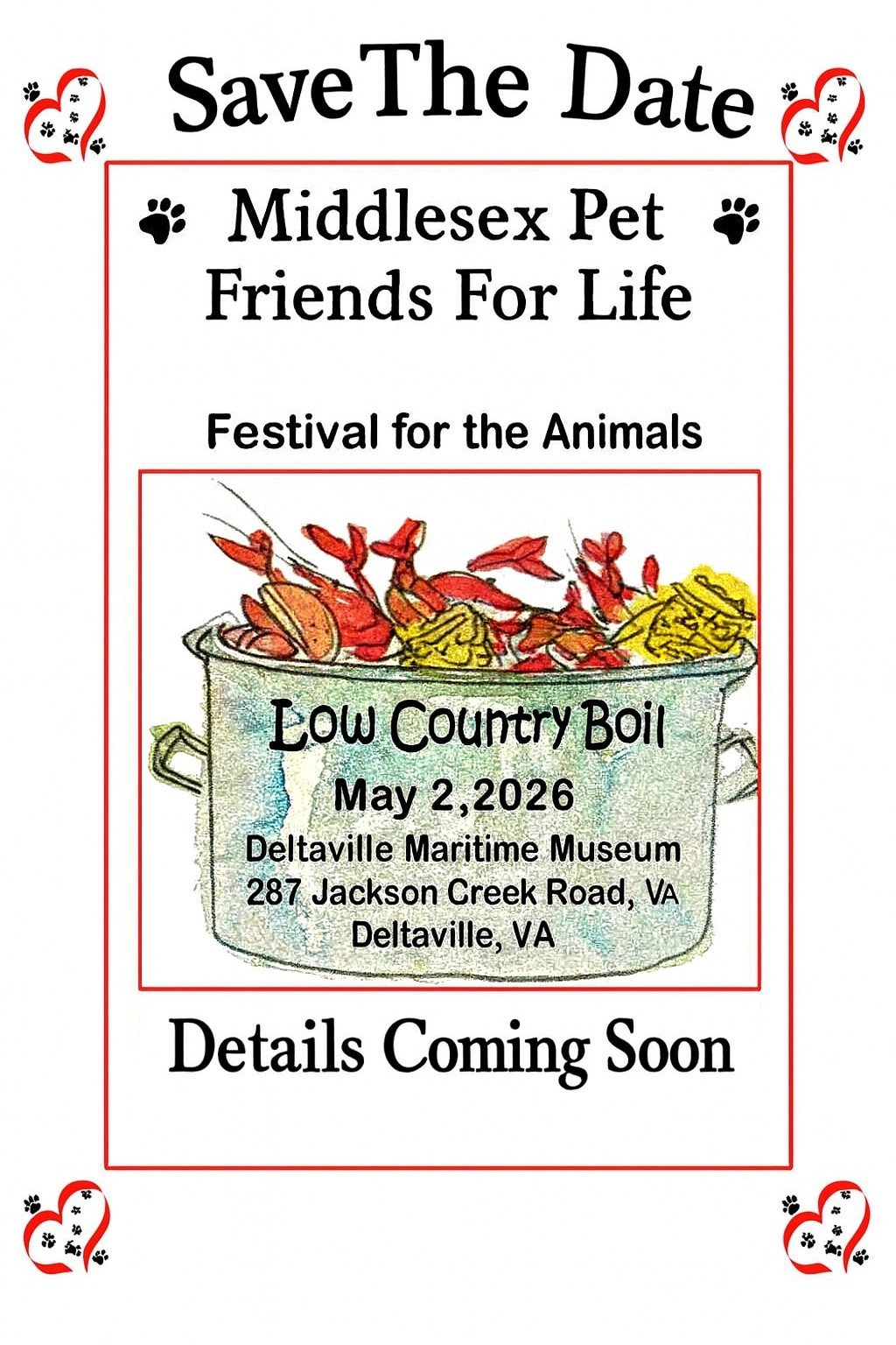 Save the date! Our annual Low Country Boil—a festival dedicated to supporting the Middlesex County Animal Shelter—is right around the corner. Hosted by Middlesex Pet Friends for Life, this fun community event is one you won’t want to miss. Start and end times coming soon.