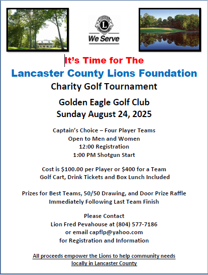 The Lancaster County Lions Foundation is hosting its signature fundraiser of the year - a Charity Golf Tournament at the beautiful Golden Eagle Golf Club on Sunday August 24th, 2025. This Captain's Choice format tournament welcomes both men and women in four player teams, with registration at 12:00PM and a 1:00PM start. As Lions, we live by our motto "We Serve." This tournament perfectly exemplifies our commitment to support local families and organizations who need our help most.